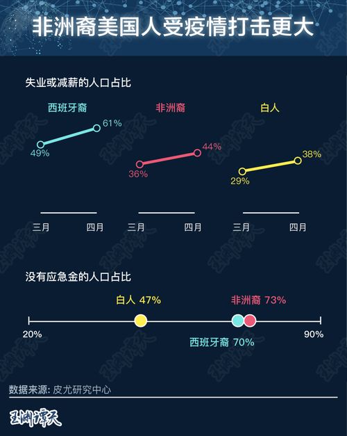 根据美国调研机构皮尤的最新调查,疫情带来的经济冲击对非洲裔和西班牙裔尤其明显,而在工作损失、减薪,和应急金上都存在着显著差异。调查显示,近四分之三的非洲裔和西班牙裔成年人,都没有应急基金来支付账单。
