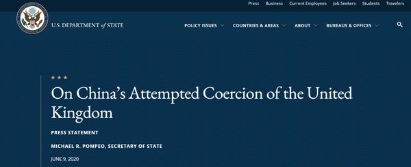 6月9日,美国国务院发表了一份名为“中国蓄意胁迫英国”的声明,称中国把汇丰银行在华商业利益作为“对抗英国的政治杠杆”。