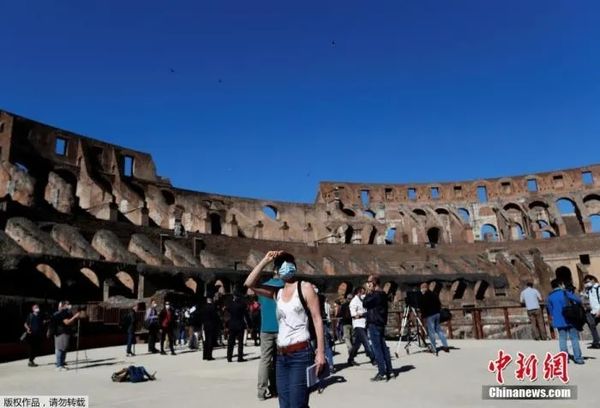 资料图:6月1日,意大利罗马斗兽场重新开放。出于防疫原因,参观者在入场时被要求戴上口罩、测量体温并进行手部消毒。