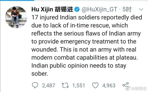 胡锡进深夜发推特,评印度军人死亡升至20人