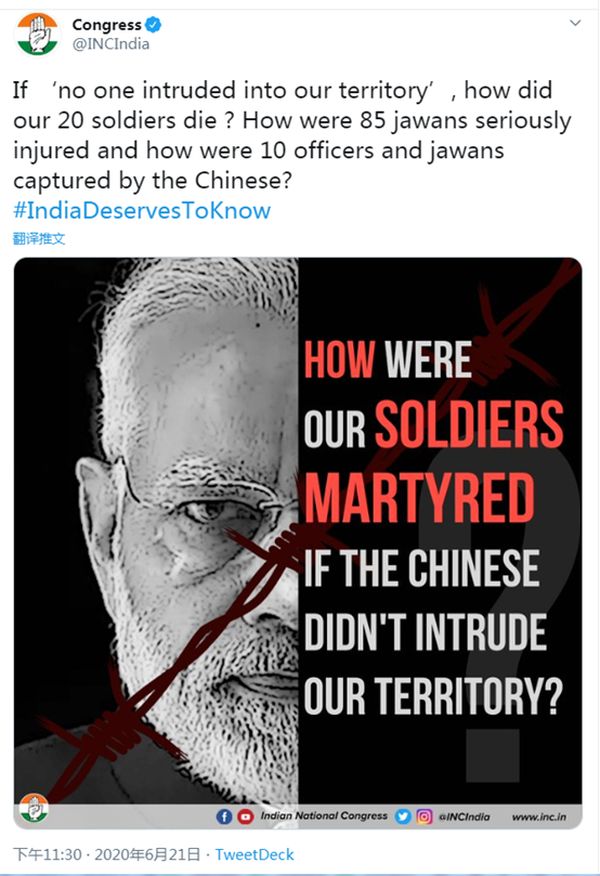 国会还问莫迪,如果中国人没有“闯入我们的领土”,那么我们20名士兵是怎么死的?