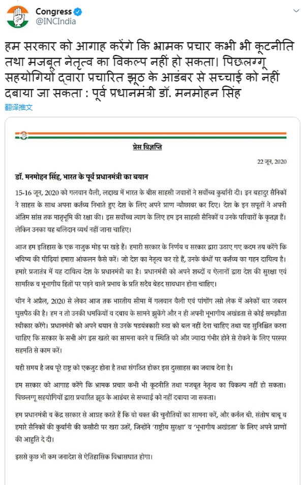 前总理辛格今天也为这场声讨莫迪的争斗送上助攻,他说领导人肩负着庄严的责任,总理必须时刻注意自己的言论对国家安全以及战略和领土利益的影响。
