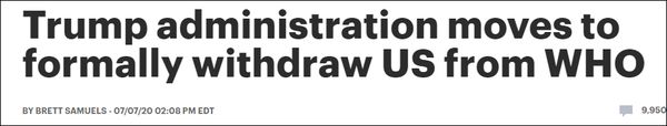 在美国新冠肺炎累计确诊数即将突破300万大关,日新增确诊数不断创下新高之际,特朗普政府于7月6日正式声明要退出世界卫生组织(WHO),结束其72年的世卫组织成员身份。