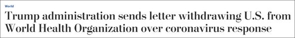 退出WHO的决定已迅速登上各家美媒的头版并引发大量批评。《国会山报》抨击称,此举会让美国丧失在全球主要公共机构的实质权力和影响力,美国终将自食其果。《华盛顿邮报》则指责说,这或对联合国机构应对疫情方面造成损害,并重塑公共卫生外交。