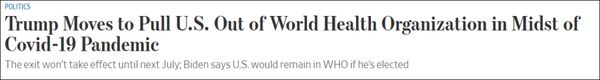 7月6日,特朗普政府已向联合国正式递交退出WHO的通知,此后将开启长达一年的退出进程,决定将于2021年7月6日才生效。根据1948年国会通过的一项联合决议,美国必须提前一年通知联合国机构并还清债务,才能正式退出。