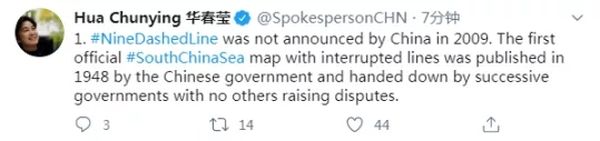 “南海断续线并不是中国在2009年才宣布的。早在1948年,在中国政府公布的第一版官方南海地图(《南海诸岛位置图》)中就标绘了南海断续线。这版地图也被历届政府所沿用,没有受到任何国家质疑。”