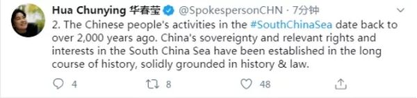 “中国人在南海地区的活动可追溯至2000多年前。中国在南海的领土主权和相关权利是在悠久的历史进程中建立的,牢固地建立在历史和法律基础之上。”