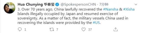 “70多年前,中国合法地收回了被日本非法占领的南沙群岛和西沙群岛,并恢复行使主权。实际上,中国收复这些岛屿所用的军舰是由美国提供的。”