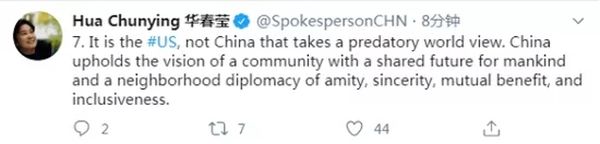 “秉持着掠夺性世界观的是美国,不是中国。中国秉持着人类命运共同体的理念,以及亲诚惠容的周边外交理念。”