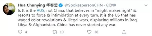 “坚信‘强权即公理’并处处诉诸武力和恐吓的是美国,不是中国。发动颜色革命和非法战争,让数百万伊拉克、利比亚和阿富汗人流离失所的(也)是美国。中国从未发动过任何战争。”