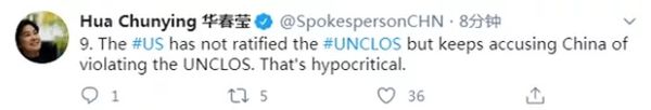 “美国自己不加入《联合国海洋法公约》,却一直指责中国违反了公约。虚伪。”