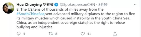 “美国,离南海几万公里远,动辄派先进军机到该地区秀肌肉,破坏了南海地区的稳定。中国,作为一个独立主权国家,有权拒绝欺凌和不公正行为。”