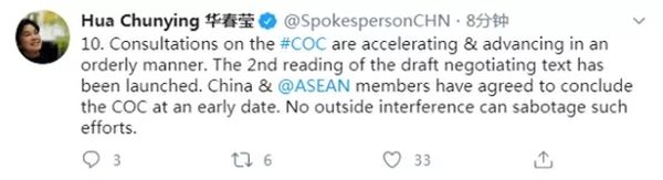 “关于‘南海行为准则’(COC)的磋商正有条不紊地加速推进。磋商文本草案已开始二读。中国和东盟成员们都同意早日缔结COC。任何外部干扰都无法破坏此种努力。”
