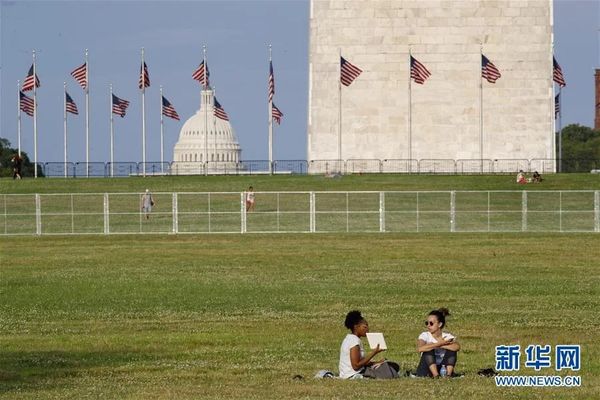 ▲6月28日,人们在美国华盛顿纪念碑(右)和国会大厦附近的草坪上休闲 。新华社发 (沈霆 摄)