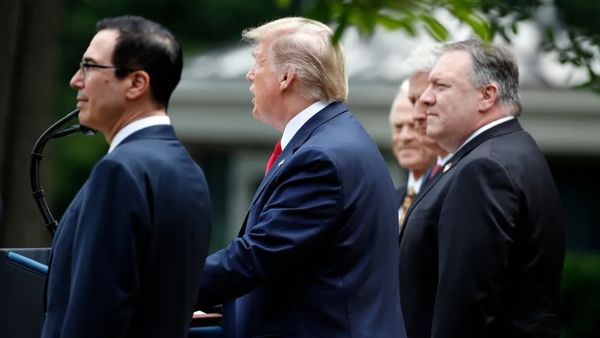 ▎特朗普在白宫玫瑰园 旁边是美国财政部长(左)与国务卿蓬佩奥(右)