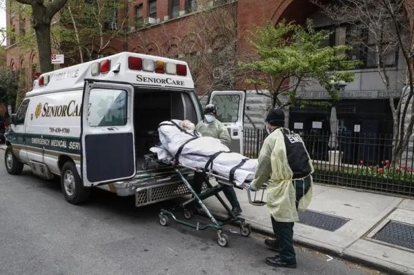 ▲资料图片:在纽约科布尔山健康中心门口,一名老年患者被抬上救护车(美联社)