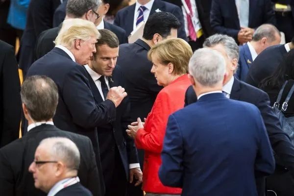 ▲资料图片:2017年7月7日,在德国汉堡,德国总理默克尔(中右)、美国总统特朗普(中左)和法国总统马克龙(中)在二十国集团(G20)峰会期间交谈。新华社发
