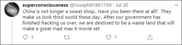 “中国不再是血汗工厂……和他们相比,我们现在看起来像第三世界。当我们的政府完成‘碾压’我们后,我们注定会成为一块可以拍一部很棒的《疯狂的麦克斯4》的荒地。”