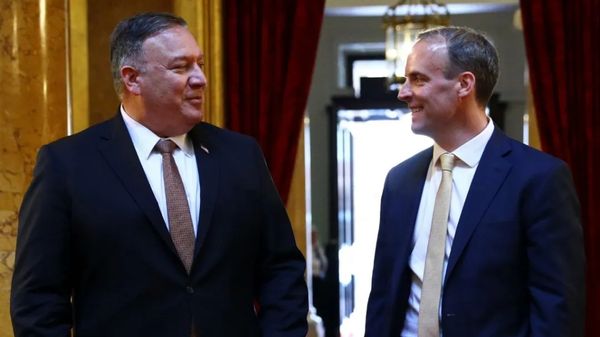蓬佩奥(左)会见英国外交大臣多米尼克·拉布,图源:英国天空新闻