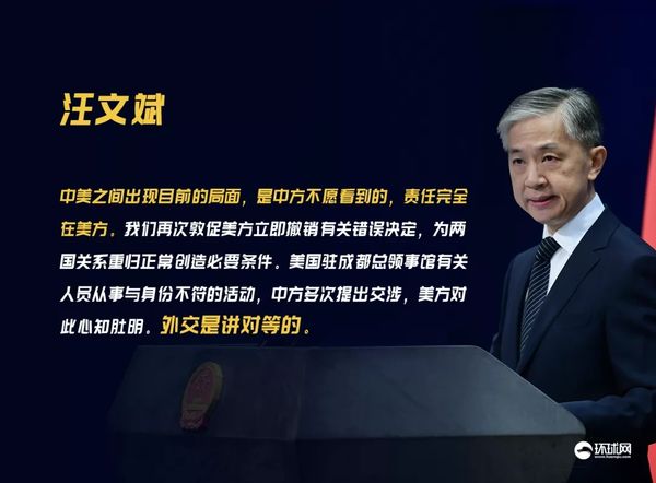 汪文斌表示,7月21日,美方单方面挑起事端,突然要求中方关闭驻休斯敦总领事馆,严重违反国际法和国际关系基本准则及中美领事条约的有关规定,严重破坏中美关系。中方上述举措是对美方无理行径的正当和必要反应,符合国际法和国际关系基本准则,符合外交惯例。
