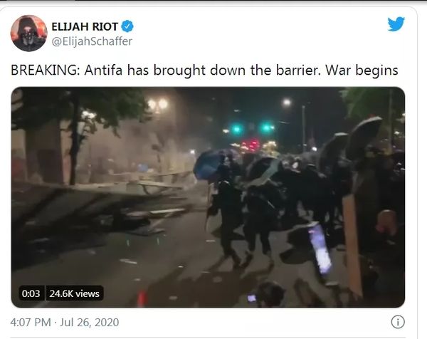 有推特网友说:“‘反法西斯运动’抗议者已拆除了障碍。战争开始。”↓