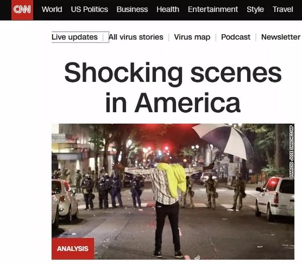 当地时间26日夜,CNN在头条发出题为“美国出现令人震惊场景”的报道,文章称,在波特兰街头,全副武装身着迷彩服的联邦特工在街头抓捕反对种族歧视的示威者,把他们带入没有明显标识的车辆,你可能会觉得这样的场景会出现在威权国家,但却出现在美国。
