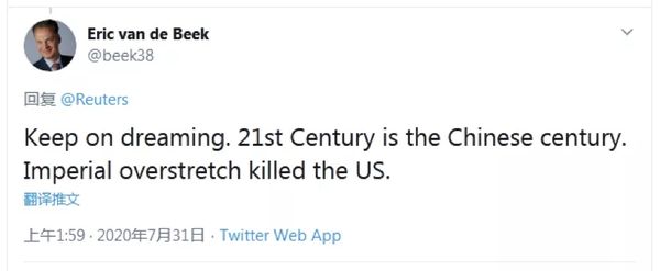 网友Eric van de Beek讽刺说,“继续做梦吧。21世纪是中国的世纪。帝国主义的过度扩张扼杀了美国。”↓