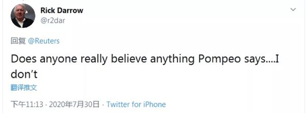 网友Rick Darrow称,“真的有人会相信蓬佩奥说的话吗……我是不信”↓