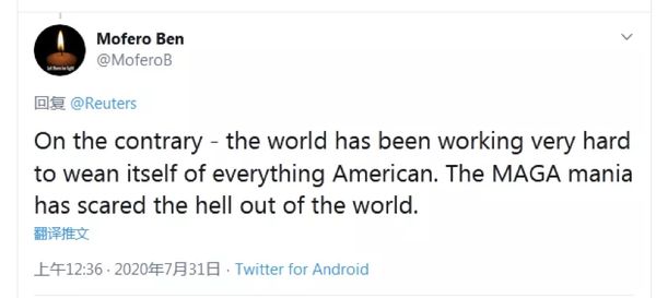 网友Mofero Ben补刀:“相反,世界一直在努力使自己摆脱美国的一切,‘让美国再次伟大’的狂热已经把世界吓得半死。”↓