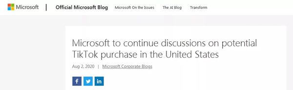 美国微软公司官网8月2日发表声明提到,将继续谈判收购TikTok在美业务的可能性。声明说,在微软首席执行官萨蒂亚•纳德拉和总统特朗普讨论后,微软准备继续谈判在美收购TikTok事宜。