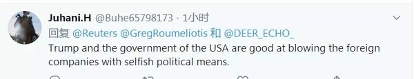 网友Juhani.H批评美国说:“特朗普和美国政府擅长用自私的政治手段赶走外国公司。”↓