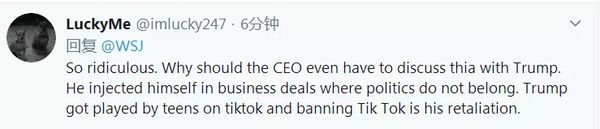 “太荒谬了。为什么(微软)CEO要和特朗普讨论这个问题?他(应该)投身于与政治无关的商业活动。特朗普在TikTok上被青少年戏耍,而禁止TikTok就是他的报复。”↓