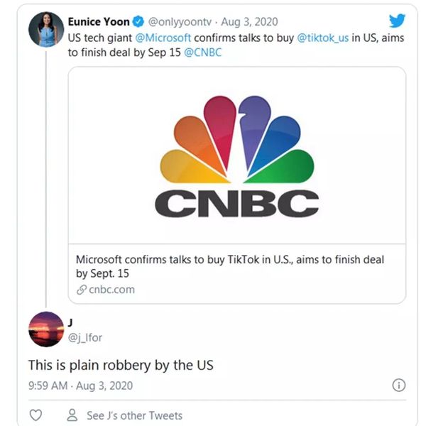 TikTok一边面对特朗普政府的威胁,一边不得不参与微软公司的收购谈判。社交媒体推特上,TikTok的处境也引发了外国网友议论。