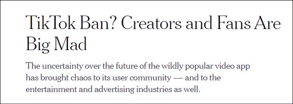 《纽约时报》报道称,当地时间8月2日,9名TikTok知名博主,其粉丝数加起来超5400万人,他们在美国自媒体平台Medium上发表了一封写给特朗普的公开信,称TikTok实现了脸书和INS等社交媒体永远无法实现的互动,呼吁要让资本来解决TikTok的问题,而不是国家干预。