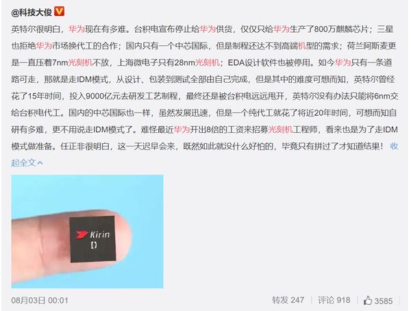 因为9月15日后台积电,将无法再承接华为高端芯片代工订单,华为麒麟高端芯片很快将成“绝版”。