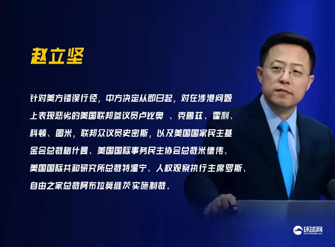 他宣布,针对美方错误行径,中方决定从即日起,对在涉港问题上表现恶劣的美国联邦参议员卢比奥 、克鲁兹、霍利、科顿、图米,联邦众议员史密斯,以及美国国家民主基金会总裁格什曼、美国国际事务民主协会总裁米德伟、美国国际共和研究所总裁特温宁、人权观察执行主席罗斯、自由之家总裁阿布拉莫维茨实施制裁。