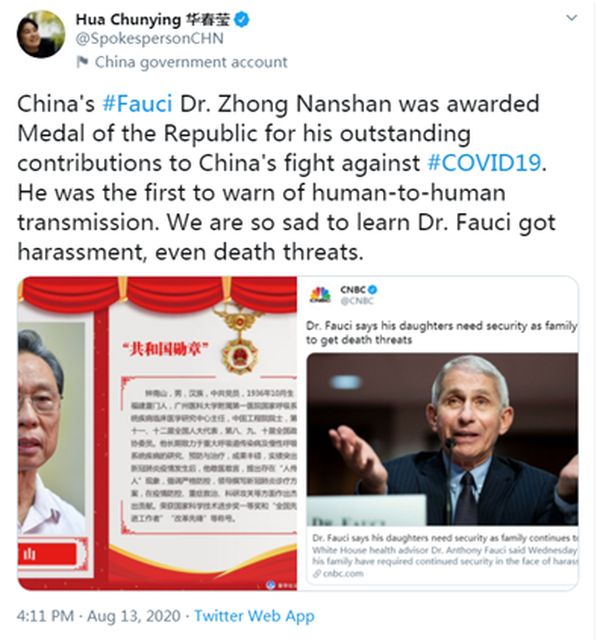 “中国版福奇、钟南山院士因在抗击新冠肺炎疫情斗争中作出杰出贡献被授予‘共和国勋章’,他是第一个发出(新冠病毒)人传人警告的人。福奇博士却被骚扰,甚至收到死亡威胁,我们很难过。”华春莹在推特上写道。