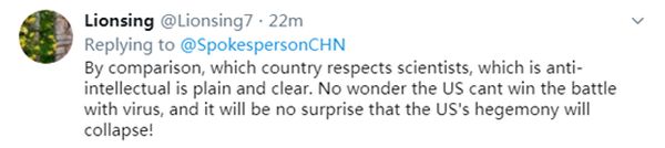 “对比之下,哪个国家尊重科学家,哪个国家反智,一清二楚。难怪美国无法赢得这场抗击病毒的战斗,美国霸权即将崩溃也不足为奇了!”
