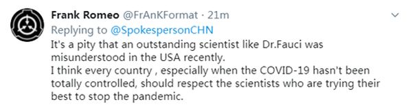 “很遗憾,像福奇博士这样杰出的科学家近来在美国被误解。我认为,每个国家,尤其是在新冠疫情还未完全控制的国家,都应该尊重那些尽最大努力遏制疫情的科学家。”