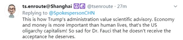 “这就是特朗普政府对科学建议的重视方式。经济和金钱比人命更重要,这就是美国寡头资本主义!很难过,福奇博士没有获得他所应该得到的赞同。”
