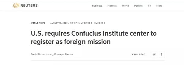 △路透社:美国要求孔子学院(美国)中心登记为“外国使团”