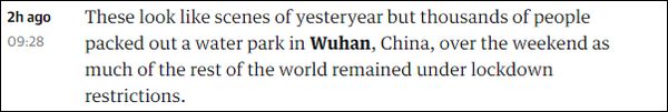 英国《卫报》称“虽然看起来像往年的场景”,但“周末确实有数千人前往武汉的水上公园。”新华社也于8月15日报道,“近日,武汉市持续高温天气,在做好新冠肺炎疫情防控的前提下,许多市民来到市内水上公园,戏水消暑。”