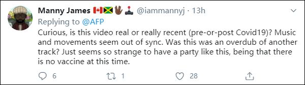 “这个视频是真的?是最近的视频(疫情之前还是之后的)?音乐和动作似乎不同步。是重新添加的音频?这样的派对太奇怪了,毕竟现在还没有疫苗。”立刻有外国网民发出一连串质疑。评论区众说纷纭,有说是2019年的老视频,有说是2018年的。