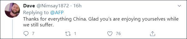 这种“阴阳怪气”的人不少——“谢谢你,中国。很高兴看到你们玩得很愉快,但我们仍然在受罪。”