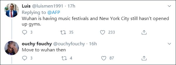 一位似乎是美国纽约的网民评论,“武汉举办了音乐节,纽约甚至连健身房都还没开。”另一位外国网民在评论区“酸”道,“那你搬到武汉去啊。”