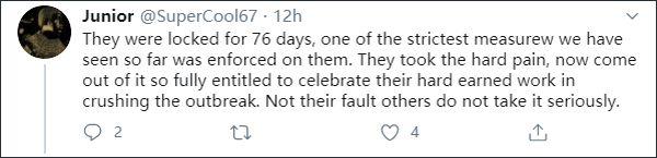 “他们封锁了76天,这是我们见过的最严格的措施之一。他们经历了巨大的痛苦,现在他们走出来了,所以完全有资格去庆祝来之不易的胜利。(疫情)不是他们的错,不要去杠他们。”有评论称。