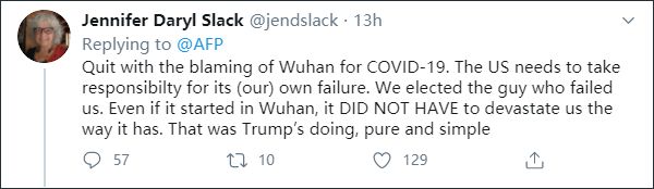 “不要再因为新冠病毒责备武汉了。美国需要为它(我们)自己的失败负责。我们选举出了一位仁兄,但他辜负了我们。即使这疫情在武汉暴发,它本不该像现在这样把美国都摧残坏了。这是特朗普造成的,多么简单的道理。”