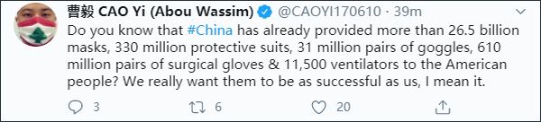 他又在原推下方追加了一条称“你知道中方已累计向美方提供口罩265亿只、防护服3.3亿件、护目镜3100万副、外科手套6.1亿双、呼吸机1.15万台吗?我们真的希望美国人民像我们(中国人)一样成功,这话一点儿不假。”