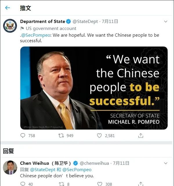 一直以来,蓬佩奥之流罔顾事实,多次试图“离间”中国人民与中国共产党,歇斯底里地呼吁中国人民追求所谓“民主自由”。曹毅推文中展示的蓬佩奥那段“祝福”就来自美国国务院7月11日的推文。