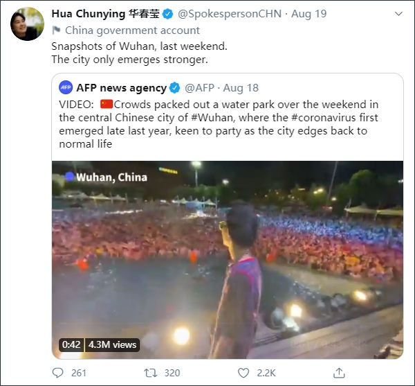 华春莹昨日也转发了法新社的报道,并评论“上周末在武汉发生的一幕。这座城市蜕变得更加强大。”